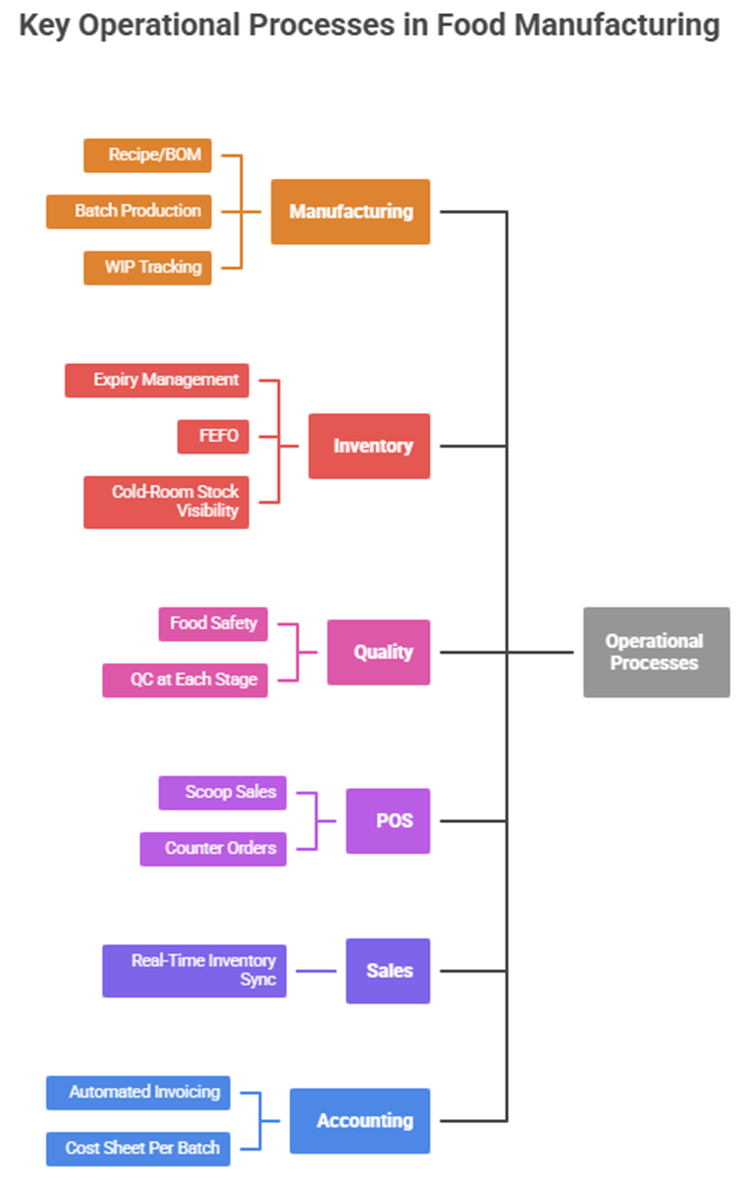 Recipe Setup → Production Planning → Multi-Stage Processing → QC → Scoop Packaging → Store Replenishment → POS/App Sales → Reporting