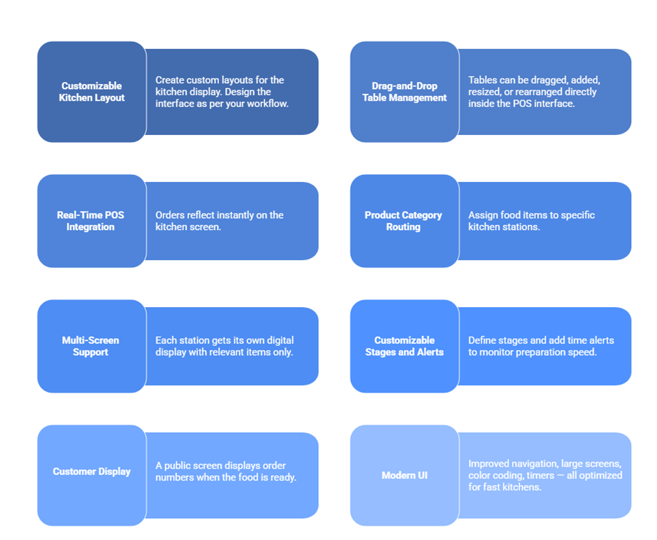 Odoo’s latest version brings a fully integrated, modern, and highly customizable Kitchen Display module — designed for speed, clarity, and perfect coordination between the POS and kitchen.